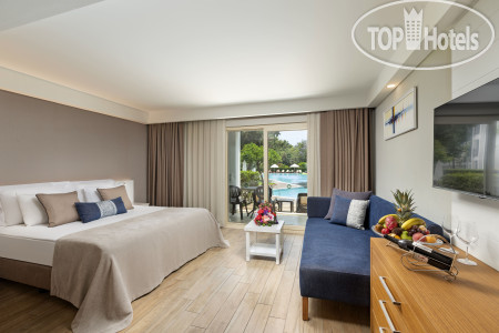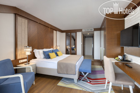 Отдыхали в отеле в конце сентября-начале октября с семьей и друзьями.Писала на топхотелс пожелание,чтобы заселили рядом,учли,спасибо! Жили в фэмили,очень комфортный двухкомнатный номер,с частичным видом на море. В номере есть межкомнатная дверь и 2 санузла,очень удобно. Территория очень зеленая,ухоженная,красивая. По еде всего достаточно,в предыдущих отзывах писали что нет кофемашин и чайников,все было. Понравился ассортимент в ресторанах работающих по меню (карбонара,рыба в кляре,бургеры достойные). Ассортимент фруктов приличный (арбузы,дыни,клубника,яблоки,груши,мандарин, Драгон фрукт,киви( безумно вкусный) ,ананас,бананы,персики,нектарины,апельсины,грейпфруты),по мне очень даже достаточно. Порадовало на завтрак наличие лосося и капрезе. Ну и в целом ассортимент хороший. Из детского меню,помимо каш,куриного супчика,овощей на пару,были очень вкусные йогурты,баночное пюре Hipp,молочные коктейли. Алкоголь вкусный (Аппероль,Пина Коллада достойные,бутылочное пиво 5 сортов,вино,шампанское,виски и многое другое). В Аквапарке очень классные горки!Анимация хорошая!И вроде пишут что отель не тусовочный,но вечером вполне хватает кавер групп,диджей играет бывает. Мини-клуб достойный👍Хорошие магазинчики на территории👍В целом отдыхом остались довольны!Омрачило отдых то,что ребенок подцепил коксаки в детском бассейне…но это дело случая…