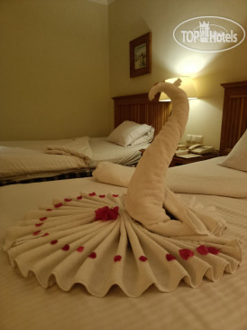 По порядку. Заселение было быстрым. Стразу обозначили, что если хотим с видом на море - можем доплатить 20$ за сутки - но решила сначала посмотреть номер, а потом в случае чего - доплатим. Номер был в корпусе 8 (8013) - нас все встроило - и по расположению, отдаленности и оснащению номера. Телевизор - плазма. Сейф, холодильник - который по всей видимости не работал, по сути он и не пригодился. Самый главный минус - номер не был подготовлен: грязно, пастельные и банные принадлежности не заменены, не было ничего из мыльных - ни шампуня, ни геля. В дальнейшем так и не положили. По факту оснащали или нет - не вникала, пользовалась своим. После трех просьб на ресепшен в течение вечера - все таки принесли и кинули чистые полотенца и пастельные. Не поменяли, а кинули. Уборки не было. По факту - убрали и поменяли постель на след день. Мы приехали в 15:00. То есть номер не готов и его не собирались готовить. Видимо рассчитывали на доплату. Фен - не работал. Был чайник, был чай и кофе, но стаканчиков не было. Так с дороги устали, что не было сил ходить качать права. На следующий день принесли баклажку воды, стаканы и дополнили чаем и кофе. И самое ужасное в отеле - это обратка сточных вод. Когда купаешься - через слив в полу, который я так и не поняла, рассчитан на что по итогу, вода идет обраткой и верхом. Это я так поняла проблема не только у нас. Везде была эта проблема постоянно. Я думаю это от системы очистки воды. Поэтому полотенец на пол было много. Это самый главный минус.