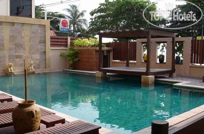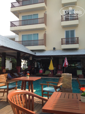 Сегодня народу прибыло в отель, бассейн конечно маловат для такого количества людей. Бассейн глубокий, вода прохладная. За бассейном есть несколько столиков, некоторые отдыхающие приносят свое пиво и спокойно попивают, никто не гоняет!))